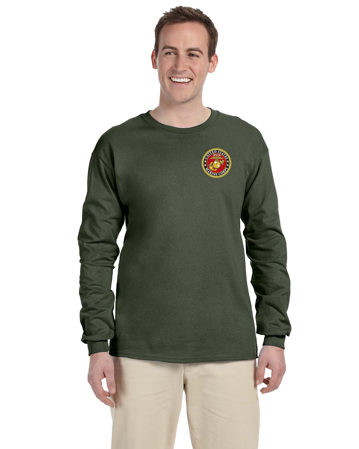 Show your pride in our returning Marines!! This product may be customized by adding a name above and/or a MOS below the insignia on the front.  Also the shirt is available with optional designs for the front, including  either an EGA or a TFSW logo.